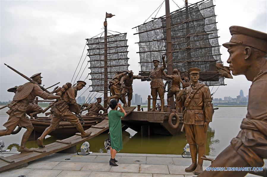 Una visitante observa esculturas que conmemoran el 90 aniversario de la fundación del Ejército Popular de Liberación (EPL), en una plaza en Nanchang, en la provincia de Jiangxi, en el este de China, el 31 de julio de 2017. La plaza de las esculturas, cubrendo una zona de 16,000 metros cuadrados, fue abierta el lunes al público. (Xinhua/Wan Xiang)