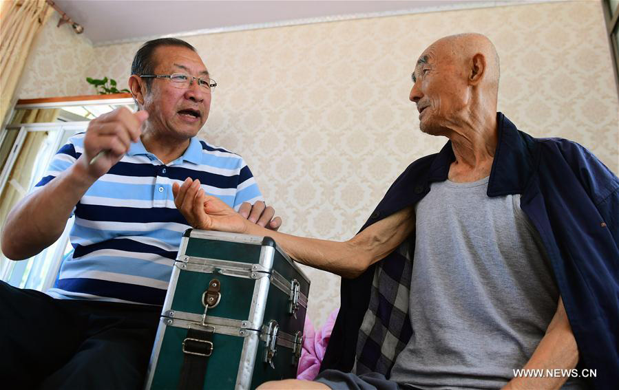 Yue Ruhua (izquierda) explica el tratamiento que debe tomar para su enfermedad pulmonar a Sun Fuxin, de 76 a?os, en la aldea Dakouqin de Houtuanshan, en la ciudad de Jilin, provincia de Jilin, el 31 de julio de 2017. [Foto / Xinhua]