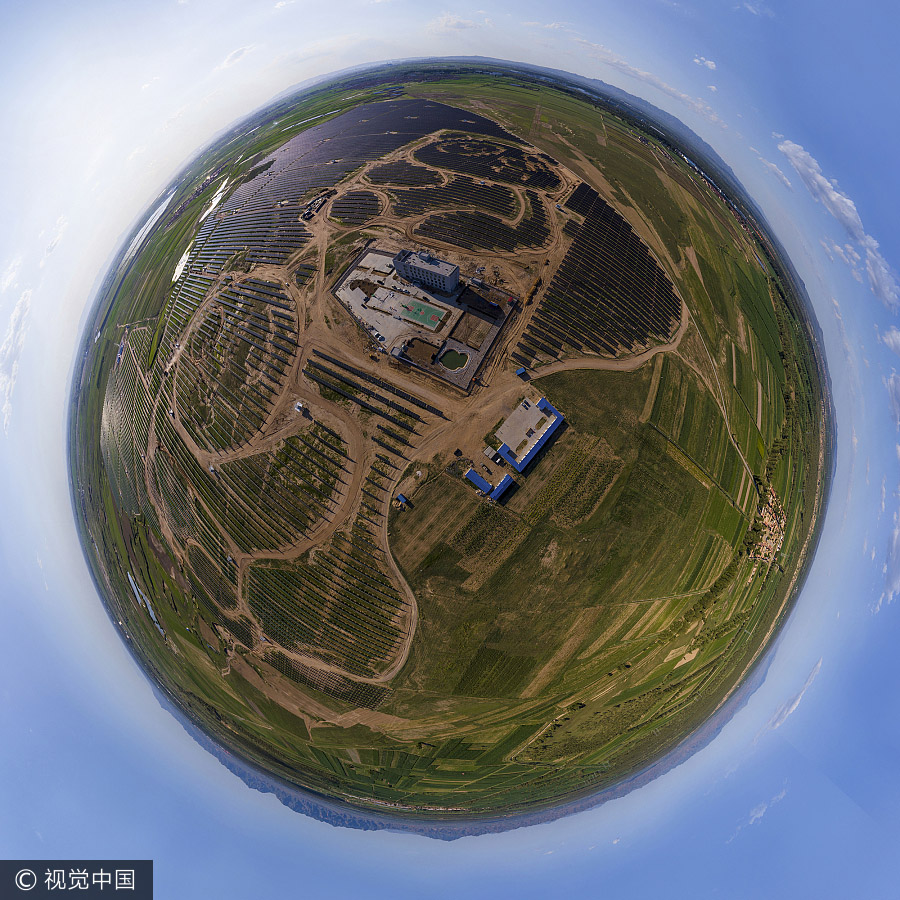 La tecnología Selfie 360 grados fue utilizada para tomar una foto de una central fotovoltaica en forma de panda en Datong, provincia de Shanxi, 10 de julio del 2017.[Foto: VCG]