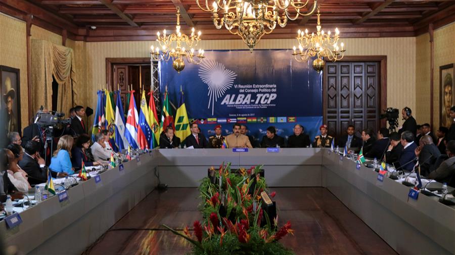 CARACAS, agosto 8, 2017 (Xinhua) -- Imagen cedida por la Presidencia de Venezuela, del presidente venezolano, Nicolás Maduro (c), participando en la 6 Reunión Extraordinaria de Consejo Político de la Alianza Bolivariana para los Pueblos de Nuestra América - Tratado del Comercio de los Pueblos (ALBA-TCP), en la sede de la Cancillería, en Caracas, Venezuela, el 8 de agosto de 2017. El canciller venezolano, Jorge Arreaza, se?aló el martes que la reunión de 17 cancilleres de la región, que se desarrolla en Perú, es parte de una "conjura" contra Venezuela. Arreaza exhortó a los países presentes de la reunión de la ALBA-TCP a "sentar las posiciones en defensa de la soberanía" de Venezuela y de la región. (Xinhua/Presidencia de Venezuela)