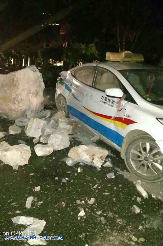 Vista de un automóvil da?ado por un sismo en el condado de Jiuzhaigou de la provincia de Sichuan, en el suroeste de China, el 8 de agosto de 2017. (Xinhua/Str)