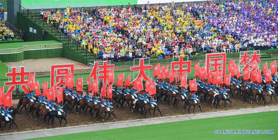 HOHHOT, agosto 8, 2017 (Xinhua) -- Jinetes actúan durante la celebración para conmemorar el 70 aniversario de la Región Autónoma de Mongolia Interior, en Hohhot, en la Región Autónoma de Mongolia Interior, en el norte de China, el 8 de agosto de 2017. (Xinhua/Lian Zhen)