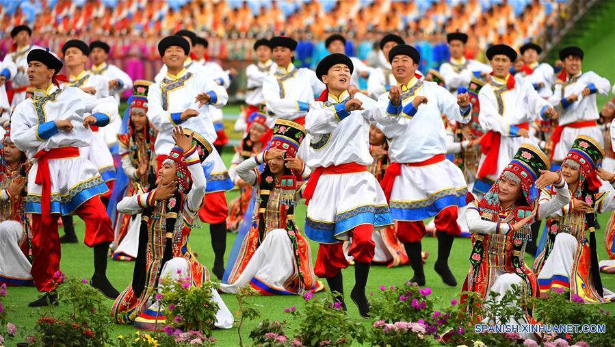 HOHHOT, agosto 8, 2017 (Xinhua) -- Bailarines actúan durante la celebración para conmemorar el 70 aniversario de la Región Autónoma de Mongolia Interior, en Hohhot, en la Región Autónoma de Mongolia Interior, en el norte de China, el 8 de agosto de 2017. (Xinhua/Deng Hua)