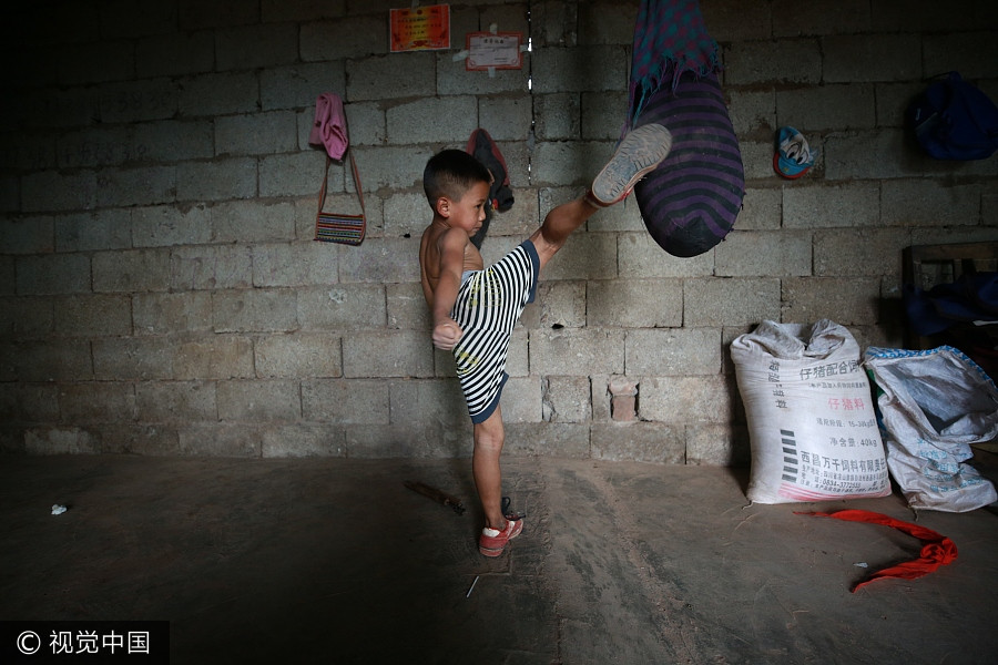 Xiabu Rihai practica cada día golpeando y pateando un saco de arena hecho por su padre.[Foto: VCG]