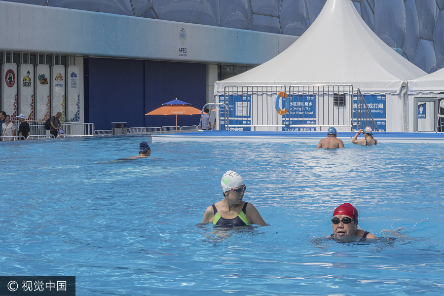 La gente nada en una piscina desmontable fuera del Cubo de Agua en Beijing, el 9 de agosto de 2017. [Foto / VCG]