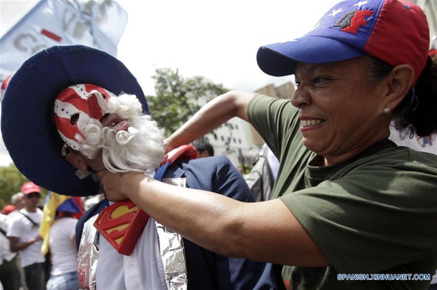 Una simpatizante del Gobierno del presidente venezolano Nicolás Maduro, participa durante una marcha en rechazo a la amenaza militar del presidente estadounidense, Donald Trump, en Caracas, Venezuela, el 14 de agosto de 2017. El presidente de Venezuela, Nicolás Maduro, ordenó el lunes realizar un ejercicio cívico-militar el próximo 26 y 27 de agosto, ante la "amenaza" belicista realizada en días pasados por el presidente estadounidense, Donald Trump, además, solicitó a la Comisión de la Verdad, Justicia y Paz constituyente, citar a todos los actores políticos que convocaron durante los últimos meses a las "guarimbas" (protestas violentas). (Xinhua/Ricardo Herdenez/AVN)