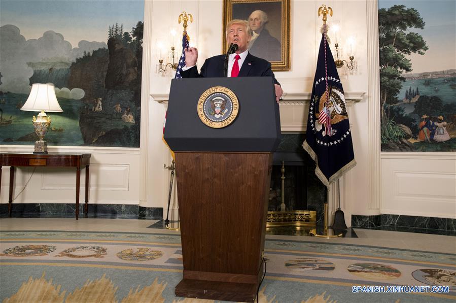 El presidente estadounidense Donald Trump, pronuncia un discurso en la Casa Blanca, en Washington D.C., Estados Unidos, el 14 de agosto de 2017. El presidente de Estados Unidos, Donald Trump, emitió el lunes una condena más enérgica en contra de los nacionalistas blancos que el fin de semana organizaron una letal protesta, luego de que sus declaraciones previas generaron críticas por su falta de contundencia. (Xinhua/Chris Kleponis/CNP/ZUMAPRESS)