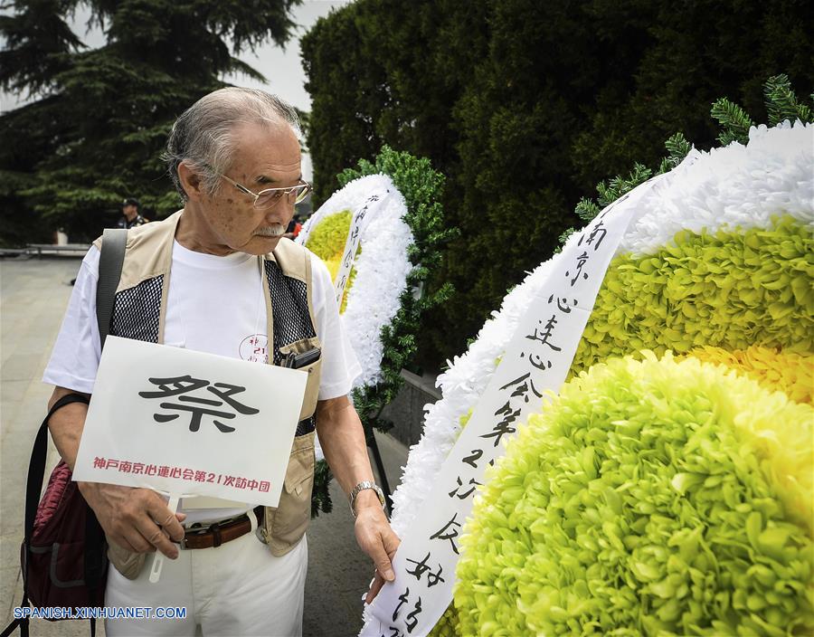 Un integrante de una Organización No Gubernamental anti-guerra con base en Kobe, Japón, asiste a la asamblea por la paz, en el Salón Memorial de las Víctimas de la Masacre de Nanjing, en Nanjing, capital de la provincia de Jiangsu, en el este de China, el 15 de agosto de 2017. Representantes de China, Japón, Pakistán, Bangladesh, Jordania, entre otros, asistieron al evento en el marco del 72 aniversario de la rendición incondicional de Japón en la Segunda Guerra Mundial. (Xinhua/Ji Chunpeng)