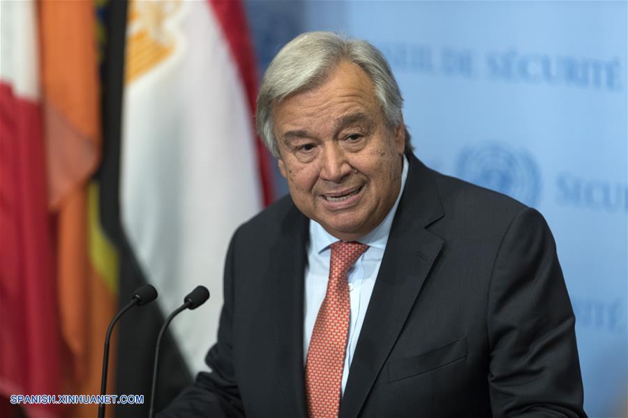 NUEVA YORK, agosto 16, 2017 (Xinhua) -- El secretario general de la Organización de las Naciones Unidas (ONU), António Guterres, participa en una conferencia de prensa en la sede de la ONU, en Nueva York, Estados Unidos, el 16 de agosto de 2017. El secretario general de la ONU, António Guterres, dijo el miércoles que República Popular Democrática de Corea (RPDC) debe "cumplir plenamente sus obligaciones internacionales" y "entablar un diálogo significativo" con el fin de reducir las tensiones en la península de Corea. (Xinhua/Li Muzi)