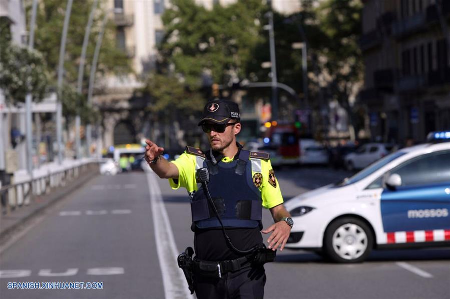 Un policía impide el paso hacia lugar donde se registró el atropellamiento de personas por parte de una furgoneta, en Las Ramblas de Barcelona, Espa?a, el 17 de agosto de 2017. (Xinhua/Albert Salamé/NOTIMEX)