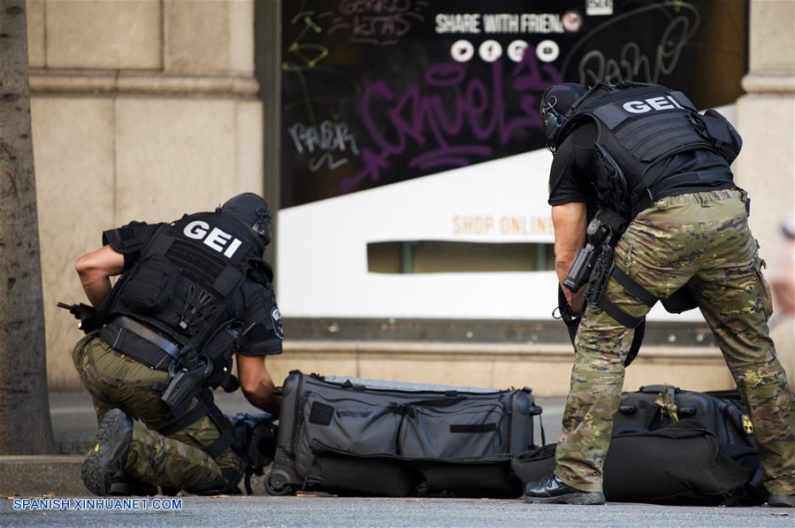 Miembros de las fuerzas especiales de la policía trabajan cerca de la Plaza Catalu?a luego de un atentado terrorista ocurrido en el centro de Barcelona, Espa?a, el 17 de agosto de 2017. (Xinhua/Lino De Vallier)