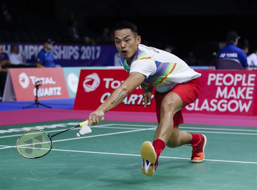 GLASGOW, 21 ago (Xinhua) -- Lin Dan de China compite durante el partido de la primera ronda del individual masculino con Kieran Merriles de Escocia en el Campeonato Mundial de Bádminton BWF en Glasgow, Escocia, Gran Breta?a el 21 de agosto. Lin ganó 2-0. (Xinhua/Shan Yuqi)