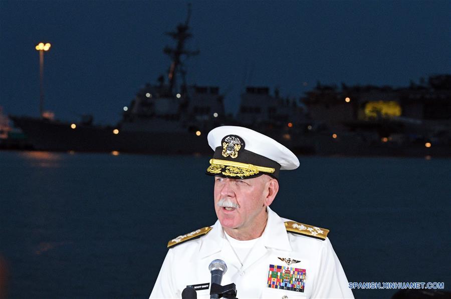 SINGAPUR, agosto 22, 2017 (Xinhua) -- El comandante de la Flota del Pacífico de Estados Unidos, Scott Swift, participa durante una conferencia de prensa sobre la colisión del USS John S. McCain con un petrolero mercante, en la Base Naval Changi de Singapur, Singapur, el 22 de agosto de 2017. El comandante de la Flota del Pacífico de Estados Unidos, Scott Swift, dijo el martes que se han encontrado restos mortales de los marineros desaparecidos en el destructor estadounidense que colisionó hace un día con un petrolero frente a la costa de Singapur. (Xinhua/Then Chih Wey)