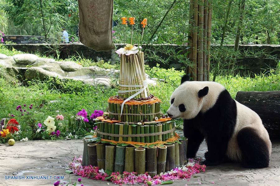 SICHUAN, agosto 23, 2017 (Xinhua) -- El panda gigante Bao Bao toma su tarta de cumplea?os en el Centro de Conservación e Investigación de China para Pandas Gigantes, en la ciudad de Dujiangyan, provincia de Sichuan, en el suroeste de China, el 23 de agosto de 2017. Bao Bao, una hembra de panda gigante nacida en Estados Unidos, celebró el miércoles su cuarto cumplea?os en la provincia de Sichuan. El personal de la base Dujiangyan del Centro de Conservación e Investigación de China para Pandas Gigantes preparó un pastel de cumplea?os de 50 kilos, hecho de bambú, zanahorias, bollos al vapor y manzanas. Bao Bao nació el 23 de agosto de 2013 en el Zoológico Nacional Smithsonian, en Washington D. C., el segundo ejemplar que nace allí. (Xinhua/Yuan Qiuyue)