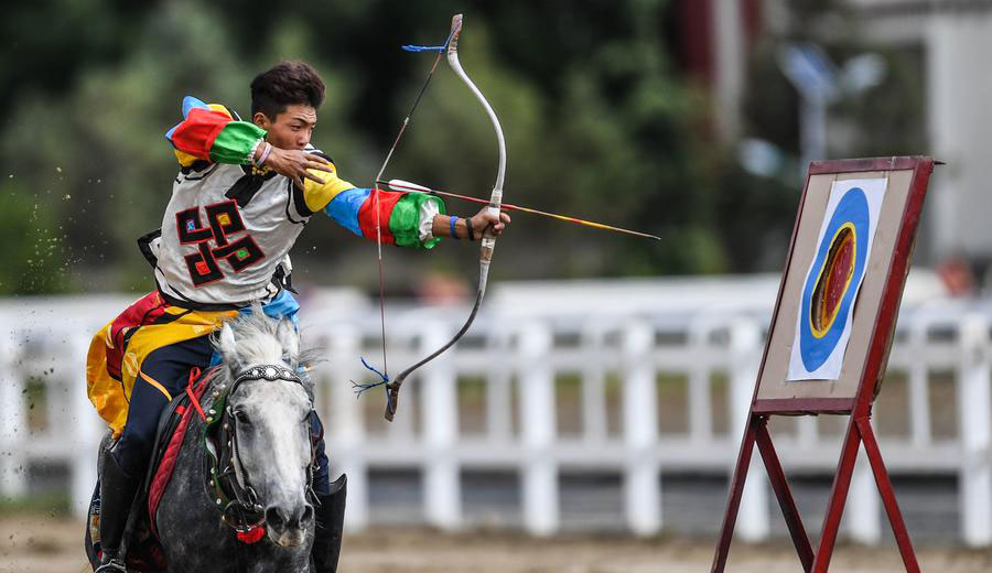 Un jinete tibetano realiza el tiro con arco durante las celebraciones del Festival Shotan en Lhasa, capital de la región autónoma de Tíbet, el 23 de agosto de 2017. [Foto / Xinhua]