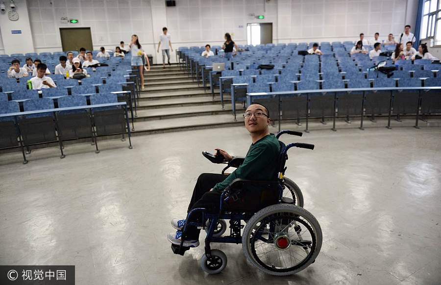 WeiXiang, estudiante de la provincia de Gansu, en el noroeste de China, llega en sillas de ruedas a la prestigiosa Universidad Tsinghua de Beijing para registrarse, el 23 de agosto de 2017. La universidad le ha asignado un apartamento gratis a él y a su madre. [Foto / VCG]