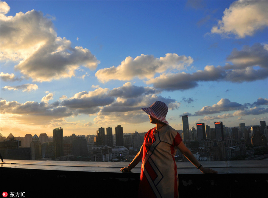 Una turista en frente del horizonte de Puxi con edificios de gran altura y el río Huangpu en un día claro en Shanghai, el 22 de agosto de 2017. [Foto / IC]