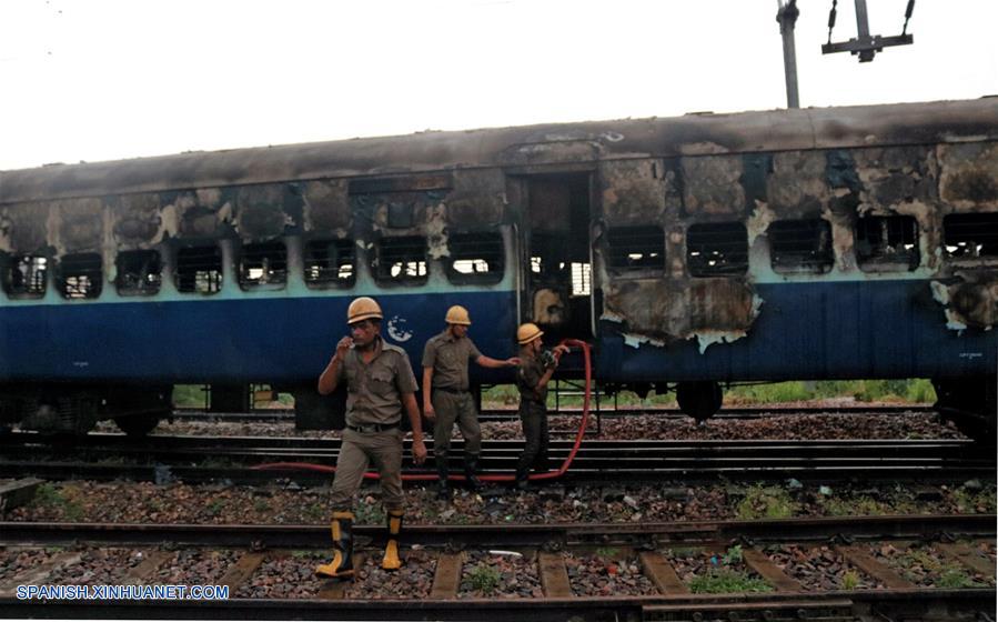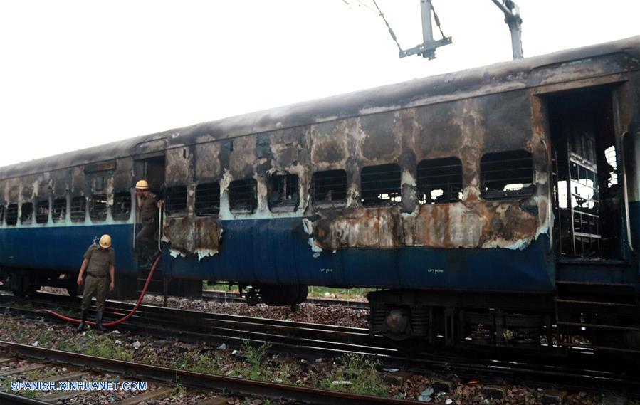 Vista de los vagones de tren quemados en la estación del ferrocarril Anand Vihar en Nueva Delhi, India, el 25 de agosto de 2017. (Xinhua/Str)