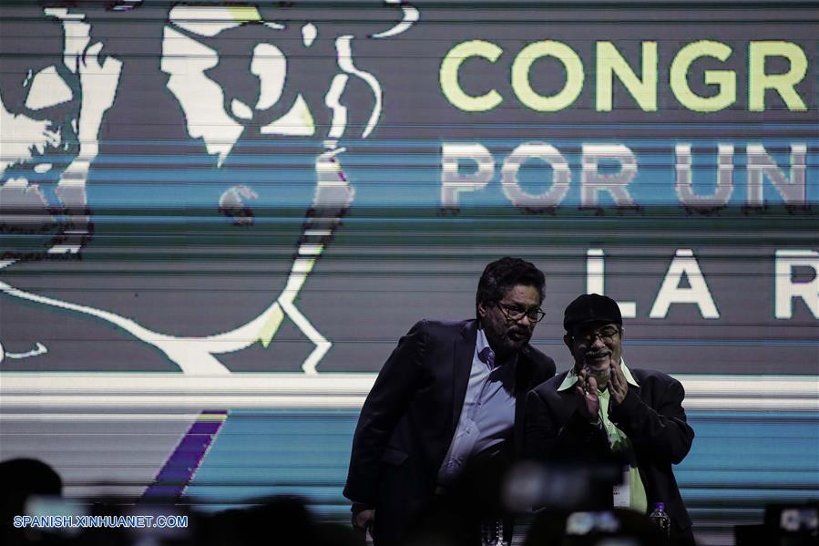 BOGOTA, agosto 27, 2017 (Xinhua) -- El comandante de las Fuerzas Armadas Revolucionarias de Colombia (FARC), Rodrigo Londo?o (d), alias "Timochenko", y el líder Luciano Marín Arango, alias "Iván Márquez" (i), participan durante la instalación del primer Congreso Nacional de las FARC en Bogotá, Colombia, el 27 de agosto de 2017. De acuerdo con información de la prensa local, miembros de las FARC participan el domingo en su primer Congreso Nacional, que se llevará a cabo hasta el jueves, para determinar los estatutos y el nombre que asumirán para convertirse en partido político. (Xinhua/Jhon Paz)