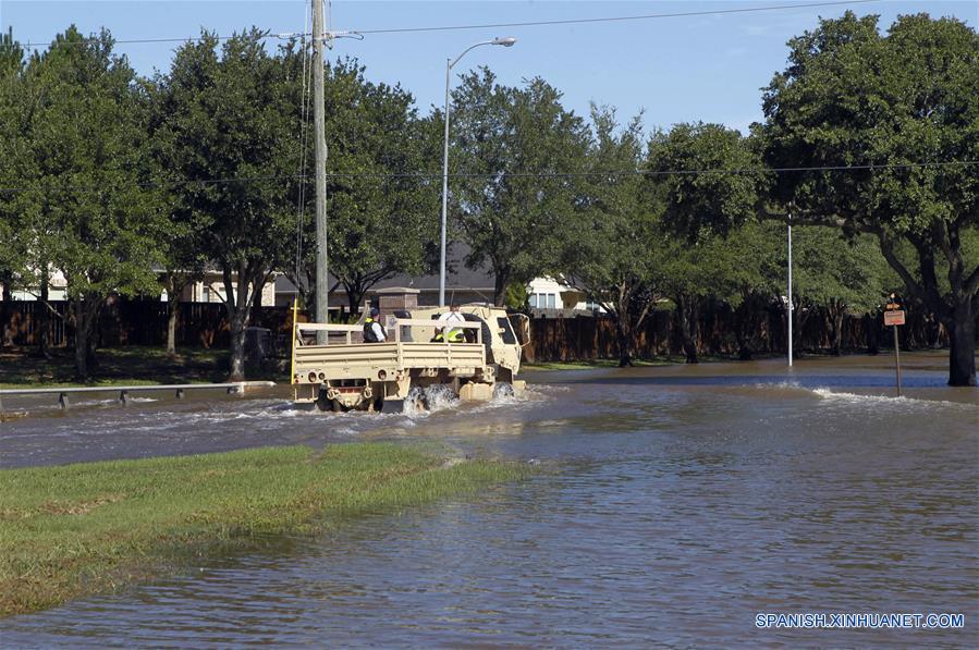 HOUSTON, agosto 30, 2017 (Xinhua) -- Un vehículo de la Guardia Nacional transita a través de un área inundada, en Houston, estado de Texas, Estados Unidos, el 30 de agosto de 2017. A medida que las aguas empiezan a retroceder en Houston, funcionarios se?alaron el miércoles que están surgiendo inquietudes sanitarias tras las fuertes inundaciones provocadas por el huracán Harvey. Los funcionarios recordaron a los residentes que deben mantenerse alejados de las aguas de la inundación pues podrían contener escombros peligrosos, cables eléctricos caídos y serpientes. También les recordaron que deben estar atentos y eliminar el agua estancada con el fin de reducir la amenaza de las enfermedades transmitidas por mosquitos. (Xinhua/Song Qiong)