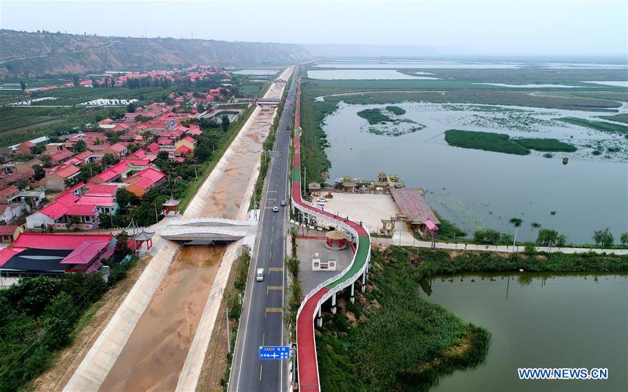 Esta foto del 3 de septiembre de 2017 muestra la colorida aldea pesquera de Huayuan a lo largo de la carretera Yanhuang en el condado Dali de la provincia de Shaanxi. Se espera que la carretera Yanhuang de 828,5 kilómetros de longitud, que bordea la orilla oeste del río Amarillo, desempe?e un papel positivo en la promoción del turismo local y la conservación ecológica de la provincia. Con un costo de 6.900 millones de yuanes (1.000 millones de dólares), la carretera que atraviesa 12 distritos y condados beneficiará a más de 2 millones de personas. (Xinhua / Tao Ming)