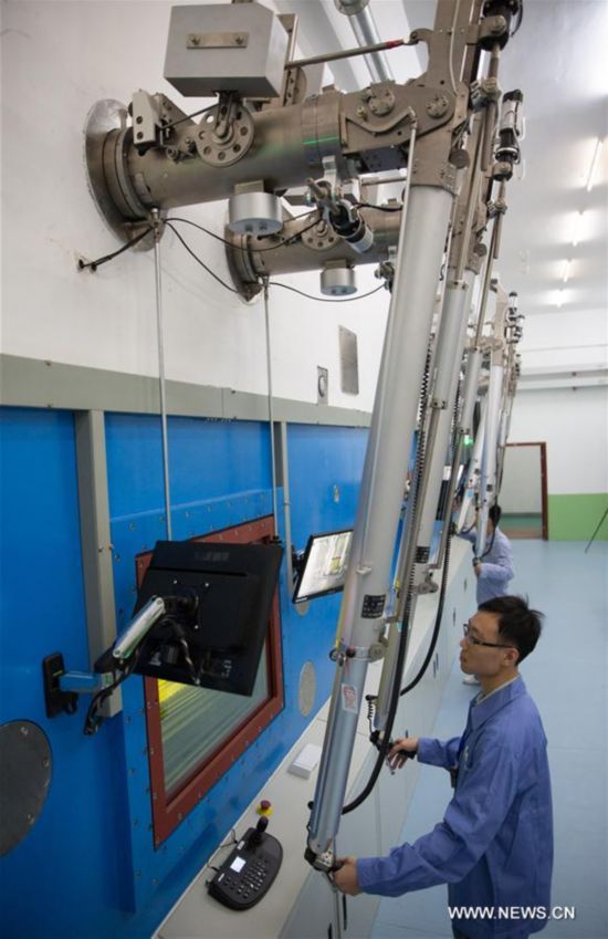 Ingenieros operan brazos mecánicos para mantener el equipo en la celda caliente de la Fuente de Neutrones porEspalación de China (CSNS) en Dongguan, provincia de Guangdong, el 1 de septiembre de 2017. (Xinhua / JinLiwang)