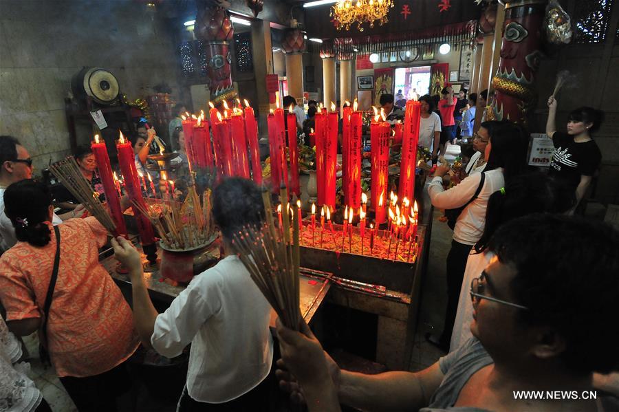 Varias personas rezan delante de un santuario durante el Festival de los Fantasmas en un templo chino en Bangkok, Tailandia, el 5 de septiembre de 2017. El festival se celebra el décimo quinto día de julio según el calendario lunar (5 de septiembre en 2017) en muchos países asiáticos, día en el que la gente visita templos o participar en rituales para mostrar respeto a los difuntos. (Xinhua / Rachen Sageamsak)
