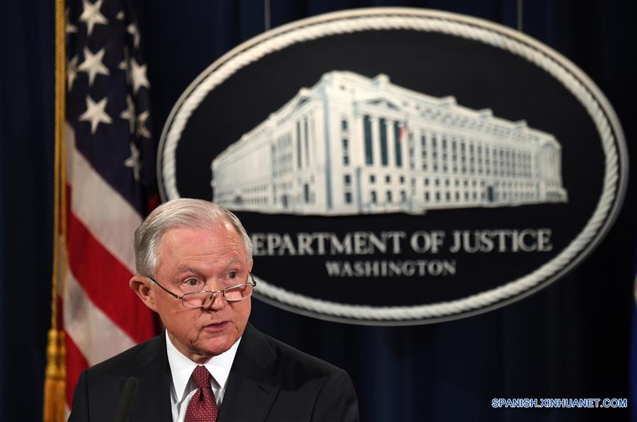 El procurador general de Estados Unidos, Jeff Sessions, participa durante una conferencia de prensa, en Washington D.C., Estados Unidos, el 5 de septiembre de 2017. El procurador general de Estados Unidos, Jeff Sessions, dijo el martes que el programa Acción Diferida para los Llegados en la Infancia (DACA, por sus siglas en inglés) ha sido rescindido, lo que pone a cerca de 800.000 inmigrantes ilegales en potencial riesgo de deportación. (Xinhua/Yin Bogu)