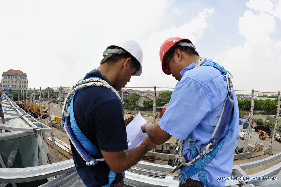 El subgerente del proyecto de construcción de la estación Ferraz de CEIEC, Jiao Yang, y el supervisor jefe del proyecto, José Costa dos Santos, verifican los datos para el ensayo de ensamblaje en Shanghai, el 25 de agosto de 2017. (Xinhua/Zhang Jiansong)