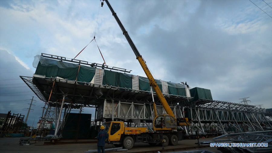 El supervisor jefe del proyecto de construcción de la estación Ferraz de CEIEC, José Costa dos Santos, examina la calidad del ensamblaje y de los módulos prefabricados en Shanghai, el 25 de agosto de 2017. (Xinhua/Zhang Jiansong)