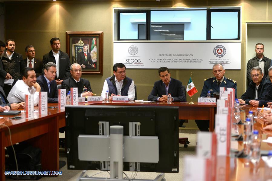 Imagen cedida por la Presidencia de México, del presidente mexicano Enrique Pe?a Nieto (4-d), reuniéndose con el secretario de Gobernación, Miguel Angel Osorio Chong (5-d), el secretario de la Defensa Nacional, Salvador Cienfuegos (3-d), y otros funcionarios tras el sismo, en el Centro Nacional de Prevención de Desastres (Cenapred), en la Ciudad de México, capital de México, el 8 de septiembre de 2017. (Xinhua/Presidencia de México)