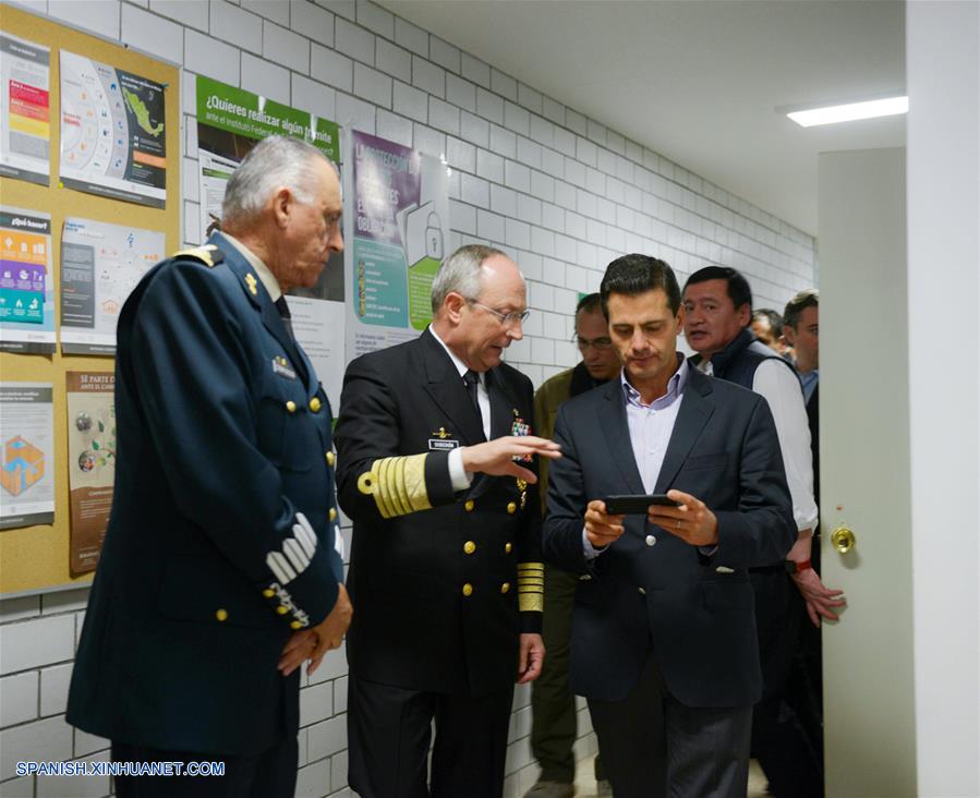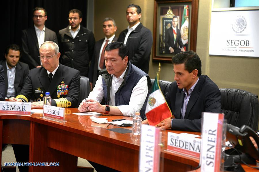 Imagen cedida por la Presidencia de México, del presidente mexicano Enrique Pe?a Nieto (d), pronunciando un mensaje a la nación acompa?ado por el secretario de Gobernación, Miguel Angel Osorio Chong (2-d), y el secretario de Marina, Francisco Soberón Sanz (3-d), en el Centro Nacional de Prevención de Desastres (Cenapred), en la Ciudad de México, capital de México, el 8 de septiembre de 2017. (Xinhua/Presidencia de México)