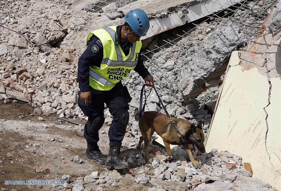 OAXACA, septiembre 8, 2017 (Xinhua) -- Un miembro de la Policía Federal trabaja con un perro rastreador en el sitio de un derrumbe provocado por un sismo en Juchitán, estado de Oaxaca, México, el 8 de septiembre de 2017. (Xinhua/David de la Paz)