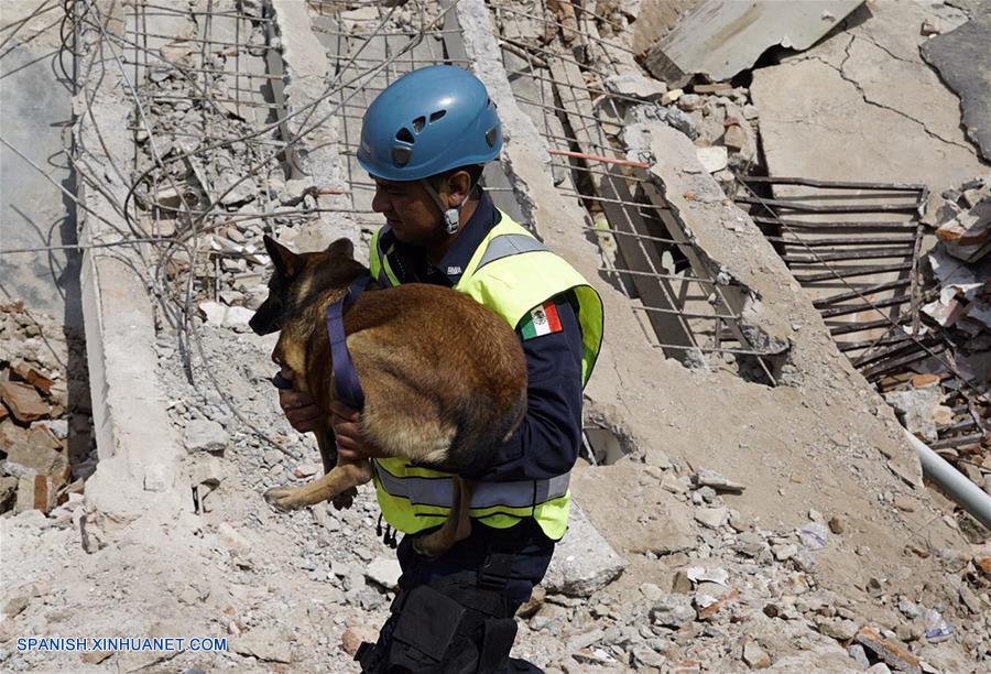 OAXACA, septiembre 8, 2017 (Xinhua) -- Un miembro de la Policía Federal trabaja con un perro rastreador en el sitio de un derrumbe provocado por un sismo en Juchitán, estado de Oaxaca, México, el 8 de septiembre de 2017. (Xinhua/David de la Paz)