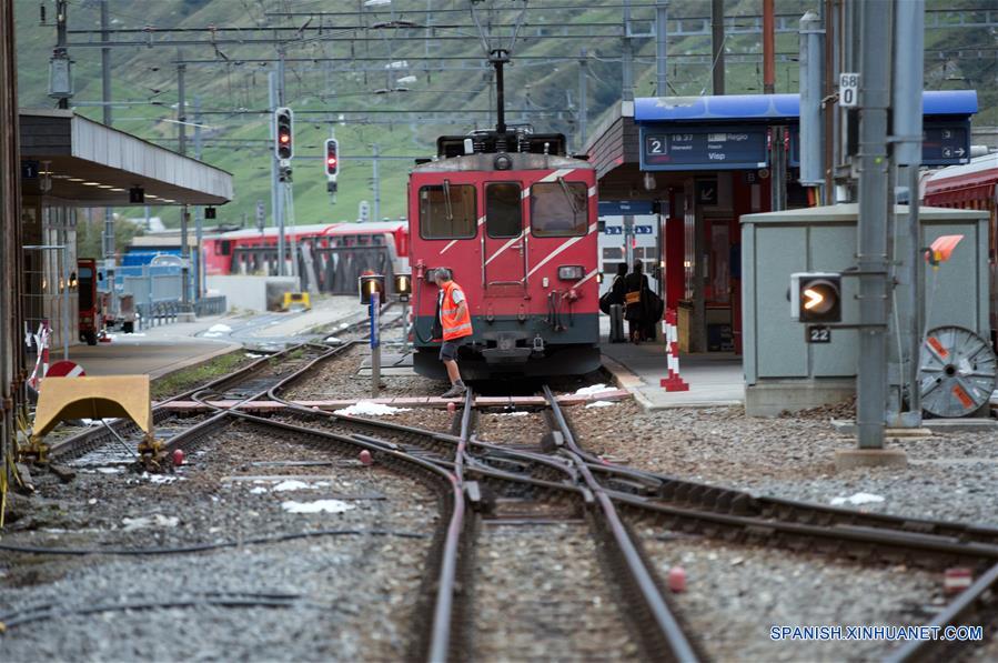 Un trabajador camina frente a un tren en la estación de trenes de Andermatt en el cantón de Uri, Suiza, el 11 de septiembre de 2017. Al menos 27 personas resultaron heridas el lunes por el choque de dos trenes ocurrido en la aldea de Andermatt, en el sur de Suiza, a las 11:30 hora local, dijo la policía local. (Xinhua/Xu Jinquan)
