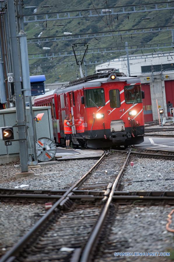 Un trabajador inspecciona un tren en la estación de trenes de Andermatt en el cantón de Uri, Suiza, el 11 de septiembre de 2017. Al menos 27 personas resultaron heridas el lunes por el choque de dos trenes ocurrido en la aldea de Andermatt, en el sur de Suiza, a las 11:30 hora local, dijo la policía local. (Xinhua/Xu Jinquan)
