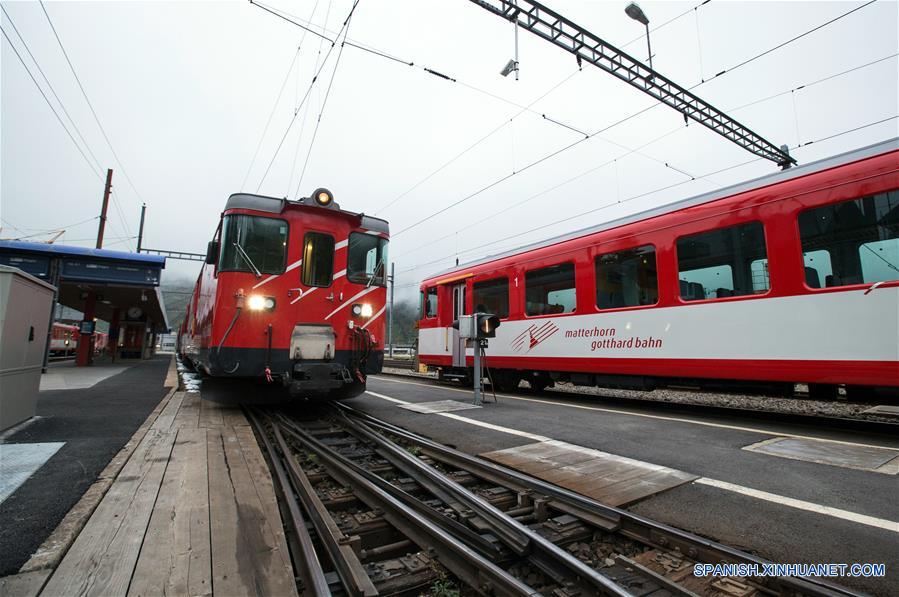 Trenes permanecen en la plataforma de la estación de trenes de Andermatt en el cantón de Uri, Suiza, el 11 de septiembre de 2017. Al menos 27 personas resultaron heridas el lunes por el choque de dos trenes ocurrido en la aldea de Andermatt, en el sur de Suiza, a las 11:30 hora local, dijo la policía local. (Xinhua/Xu Jinquan)