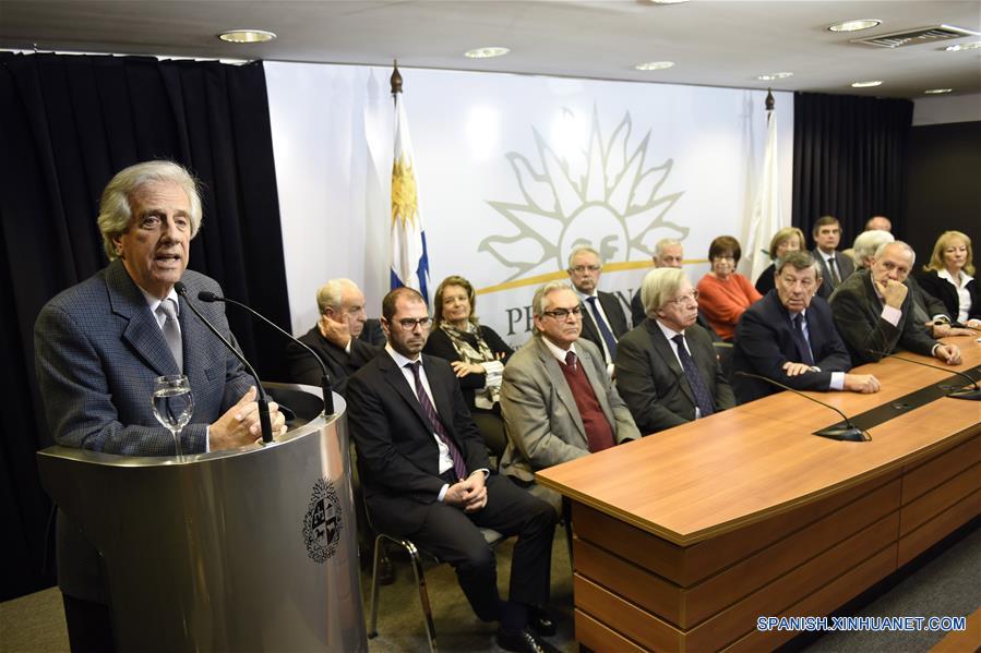 El presidente uruguayo, Tabaré Vázquez (i), acompa?ado por los ministros de gobierno, participa durante una conferencia de prensa acerca de la renuncia del vicepresidente Raúl Sendic, en Montevideo, capital de Uruguay, el 11 de septiembre de 2017. El presidente de Uruguay, Tabaré Vázquez, dijo el lunes que el gobierno continuará con normalidad pese a la renuncia del vicepresidente uruguayo, Raúl Sendic. "La situación generada ante la renuncia del se?or Raúl Sendic se ha sustanciado dentro del fuerte marco institucional que felizmente el país tiene, y que es una realidad y un legado que debemos cuidar todos los uruguayos", sostuvo Vázquez. Sendic dimitió el 9 de septiembre acorralado por cuestionamientos éticos sobre gastos personales con una tarjeta corporativa durante su gestión en la estatal Administración Nacional de Combustibles, Alcohol y Portland (ANCAP). (Xinhua/Nicolás Celaya)