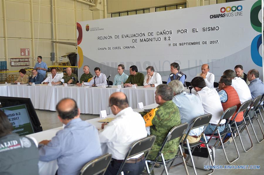 Imagen cedida por la Presidencia de México, del presidente mexicano, Enrique Pe?a Nieto (c-atrás), encabezando una reunión de evaluación de da?os con su Gabinete y autoridades estatales y municipales, en Chiapa de Corzo, estado de Chiapas, México, el 11 de septiembre de 2017. La reconstrucción de las viviendas da?adas por el terremoto del pasado jueves en los estados de Chiapas y Oaxaca comenzará la próxima semana, anunció el lunes el presidente de México, Enrique Pe?a Nieto. (Xinhua/Presidencia de Méixco)