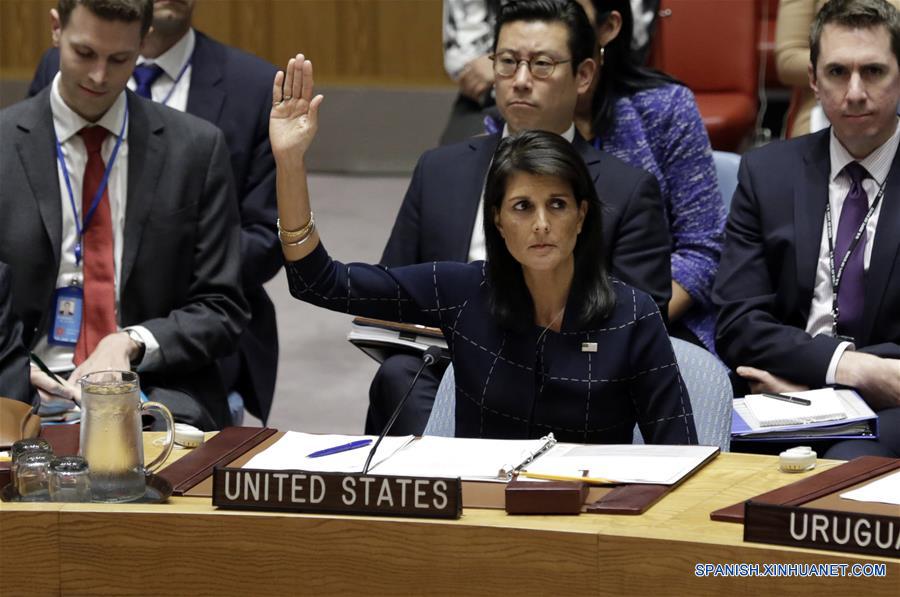 La embajadora de Estados Unidos para la Organización de las Naciones Unidas (ONU), Nikki Haley (frente), vota a favor de una resolución del Consejo de Seguridad para imponer nuevas sanciones a República Popular Democrática de Corea (RPDC) por su último ensayo nuclear, en la sede de la ONU, en Nueva York, Estados Unidos, el 11 de septiembre de 2017. El Consejo de Seguridad de la ONU adoptó el lunes por unanimidad una resolución que impone nuevas sanciones contra República Popular Democrática de Corea (RPDC) por la prueba nuclear realizada el 3 de septiembre en violación de resoluciones anteriores. (Xinhua/Li Muzi)