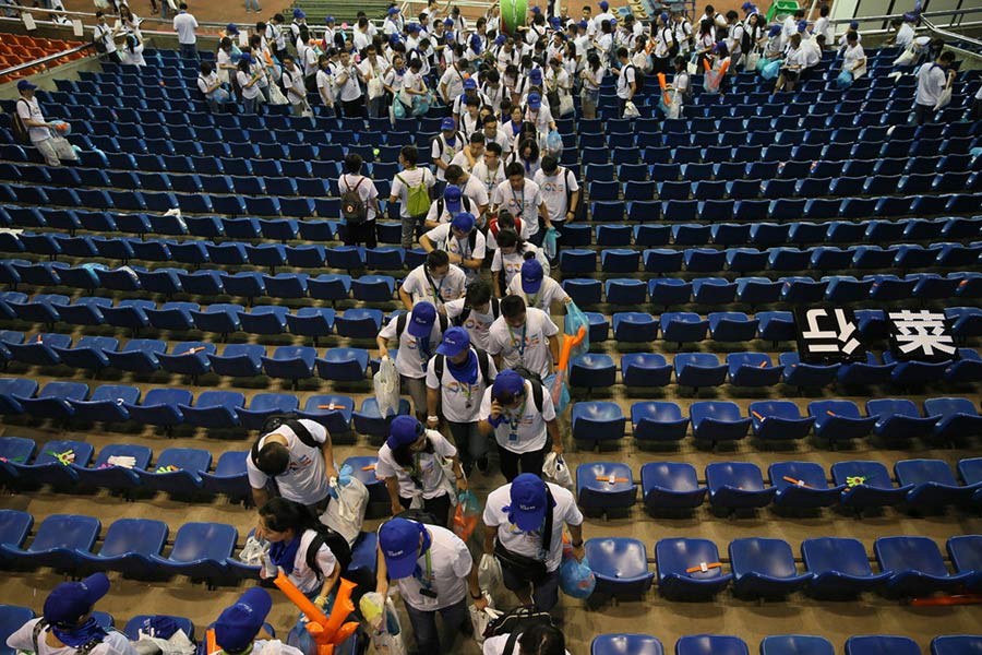 Después de la fiesta, los 40.000 empleados allí presentes se llevaron toda la basura y desperdicios de la celebración dejando el estadio completamente limpio, en el Centro Deportivo Dragón Amarillo en la ciudad de Hangzhou, provincia de Zhejiang, el 8 de septiembre de 2017. [Foto / IC]