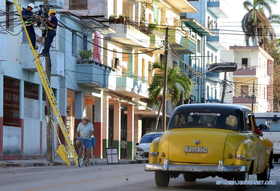 LA HABANA, septiembre 17, 2017 (Xinhua) -- Empleados revisan cables de electricidad en el municipio Cerro, en La Habana, Cuba, el 17 de septiembre de 2017. Una semana después del paso del huracán Irma por Cuba, los habitantes de la isla se esfuerzan por recuperarse de los destrozos causados por el violento meteoro que alcanzó la categoría cinco, la máxima de la escala Saffir-Simpson. Miles de cubanos salieron este fin de semana a las calles de La Habana en cumplimiento de un llamado gubernamental para cooperar con el saneamiento de la capital, donde viven más de dos millones de personas. El paso de Irma, considerado el mayor huracán formado en el Atlántico, dejó de manera preliminar 10 muertos, 1,7 millones de personas desalojadas, fuertes inundaciones y graves da?os en el sistema eléctrico nacional. (Xinhua/Joaquín Hernández)