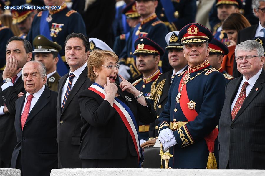 La presidenta de Chile, Michelle Bachelet (c) participa durante la Gran Parada Militar en Honor a las Glorias del Ejército 2017, en Santiago, capital de Chile, el 19 de septiembre de 2017. Más de 7,000 efectivos uniformados de las Fuerzas Armadas de Chile desfilaron el martes durante la Parada Militar 2017, una ceremonia anual encabezada por la presidenta del país, Michelle Bachelet, en el Parque O'Higgins de Santiago. (Xinhua/Jorge Villegas)
