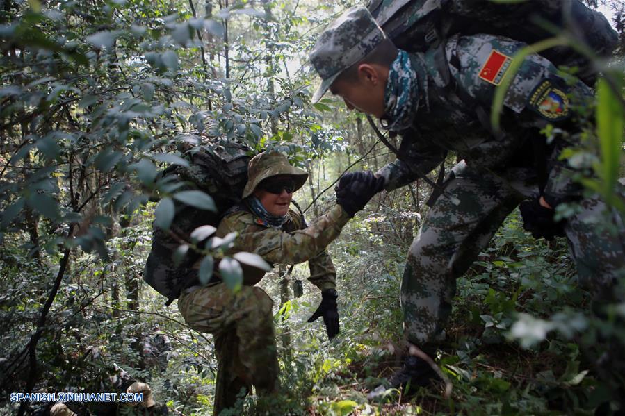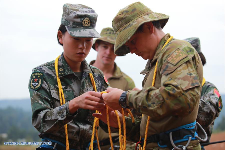 YUNNAN, septiembre 21, 2017 (Xinhua) -- Imagen del 15 de septiembre de 2017 de soldados de China y Australia asistiendo a un ejercicio conjunto de entrenamiento militar llamado "Ejercicio Panda-Canguro 2017", en Kunming, capital de la provincia de Yunnan, en el suroeste de China. Los ejércitos de China y Australia llevaron a cabo un ejercicio conjunto de entrenamiento militar en territorio chino. El "Ejercicio Panda-Canguro 2017" tuvo lugar en un campo de entrenamiento en Kunming, capital de la provincia suroccidental de Yunnan, informaron el jueves fuentes militares chinas. Veinte militares, diez por cada país, participaron en la capacitación, que comenzó el 10 de septiembre y concluyó el miércoles. (Xinhua/Yang Jicheng)