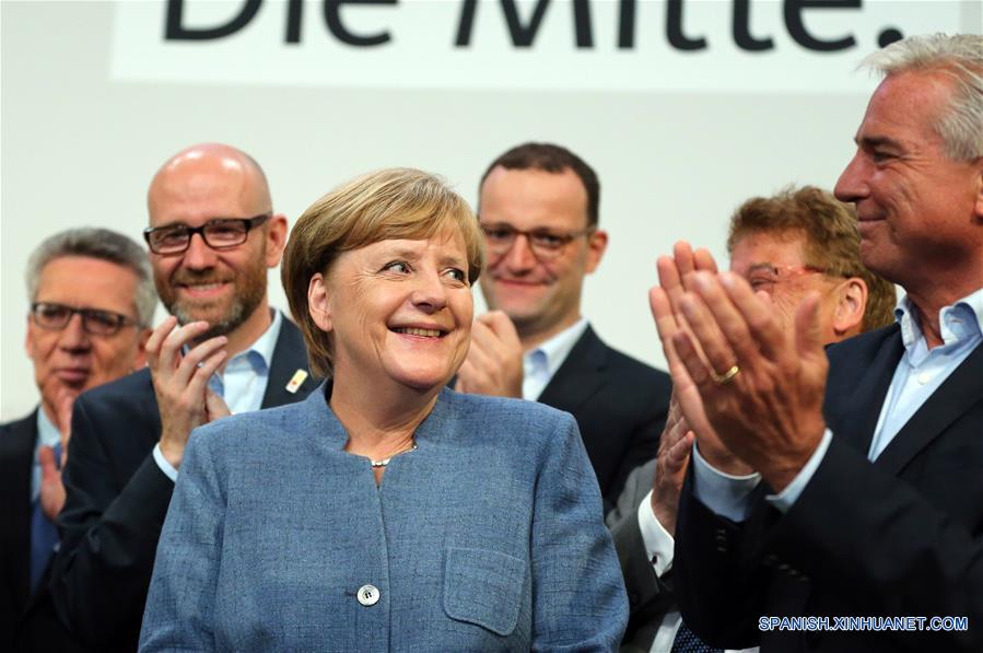 BERLIN, septiembre 24, 2017 (Xinhua) -- La canciller de Alemania, Angela Merkel (i-frente), reacciona luego de escuchar los resultados de la encuesta de salida en la sede de la Unión Demócrata Cristiana (UDC), en Berlín, Alemania, el 24 de septiembre de 2017. La unión conservadora encabezada por la canciller de Alemania, Angela Merkel, defendió el domingo su posición dominante en el Parlamento alemán al recibir 32.5 por ciento de los votos, de acuerdo con una encuesta de salida. (Xinhua/Luo Huanhuan)