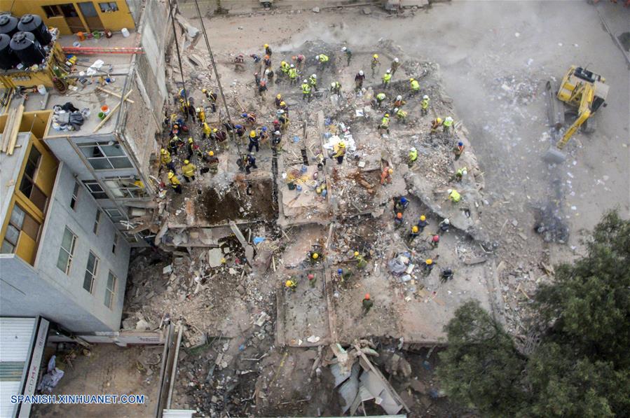 CIUDAD DE MEXICO, septiembre 25, 2017 (Xinhua) -- Imagen tomada con un dron, de rescatistas y voluntarios laborando en los esfuerzos de rescate luego de un sismo, en la Ciudad de México, capital de México, el 25 de septiembre de 2017. (Xinhua/César Vicu?a)