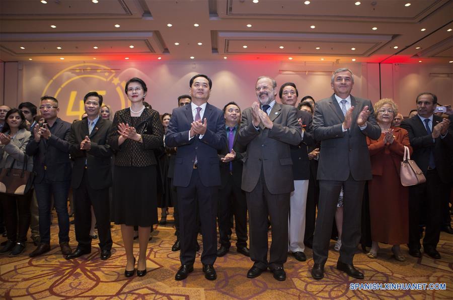 El embajador de China en Argentina, Yang Wanming (c), y su esposa, Lu Yanliu (4-i), participan durante una recepción para festejar el 68 aniversario de la fundación de la República Popular China, en Buenos Aires, Argentina, el 26 de septiembre de 2017. El embajador chino ante Argentina, Yang Wanming, afirmó el martes que la "nueva normalidad" del país asiático es una "gran oportunidad para profundizar y expandir la cooperación" entre Beijing y Buenos Aires. "Durante estos últimos cinco a?os, la integración de China con el mundo ha alcanzado un nuevo nivel. La parte china apuesta por construir nuevas relaciones internacionales, con foco en la cooperación de ganancia compartida", enfatizó el diplomático. Yang hizo estas declaraciones durante una recepción para festejar el 68 aniversario de la fundación de la República Popular China, acto al que asistieron, entre otros, el gobernador de la provincia de Jujuy, Gerardo Morales, el ministro de Ambiente y Desarrollo Sustentable, Sergio Bergman, y el diputado oficialista Eduardo Amadeo. (Xinhua/Martín Zabala)