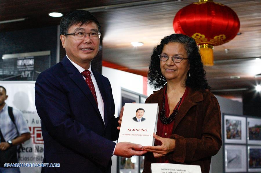 CARACAS, septiembre 26, 2017 (Xinhua) -- El embajador de China en Venezuela, Zhao Bentang (i), y la ministra venezolana para la Cultura, Alejandrina Reyes (d), sostienen un ejemplar de "La gobernación y administración de China" del presidente de China, Xi Jinping, durante la donación de 35 títulos literarios por parte de la embajada china en Venezuela, en la Biblioteca Nacional de Venezuela en Caracas, capital de Venezuela, el 26 de septiembre de 2017. En una nueva muestra de afianzamiento de la cooperación cultural bilateral, la embajada de China en Caracas donó el martes 35 títulos literarios a la Biblioteca Nacional de Venezuela, con más de 385 ejemplares distribuidos en diversos temas. El acercamiento en el ámbito literario permite llevar la relación de ambos países a un nuevo punto, en el que el conocimiento sobre la civilización y la cultura china cobran elevado interés para la población venezolana, con énfasis en su juventud. La donación forma parte de una programación dise?ada por el Ministerio venezolano para la Cultura y denominada "Octubre Rojo", que está dirigida a homenajear los 68 a?os de la fundación de la República Popular China así como a difundir los rasgos más elementales de esta parte de la cultura asiática. También se mantiene la exposición fotográfica "Contando China 2017", contentiva de 54 fotografías de diversos artistas de la luz, que reflejan a través de estas imágenes la vida urbana y rural del gigante asiático, y la cual se extenderá próximamente a 24 bibliotecas principales de igual número de regiones. (Xinhua/Boris Vergara)
