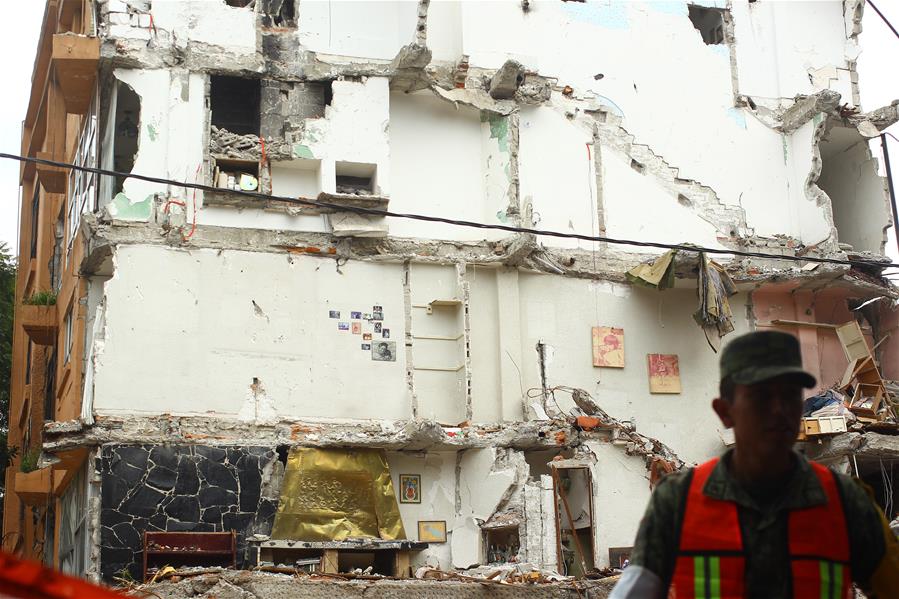 CIUDAD DE MEXICO, septiembre 27, 2017 (Xinhua) -- Un soldado reacciona frente a un edificio derrumbado luego de un sismo, en el cruce de las calles Yacatas y Concepción Béistegui, en la Ciudad de México, capital de México, el 27 de septiembre de 2017. El presidente de México, Enrique Pe?a Nieto, calculó el miércoles en 38,150 millones de pesos (unos 2,119 millones de dólares estadounisenses) el costo de la reconstrucción por los terremotos del 7 y 19 de septiembre. A poco más de una semana de registrarse un terremoto de 7,1 grados en la escala de Richter que golpeó al centro del país y que se ha cobrado hasta ahora la vida de 338 personas, el mandatario agradeció el respaldo del sector privado para facilitar las obras de reconstrucción. Ese terremoto se registró 12 días después de que México se sacudiera por otro sismo, este de 8,4 grados, calificado por el gobierno como el "de mayor intensidad" en un siglo en el sur del país. (Xinhua/Str)
