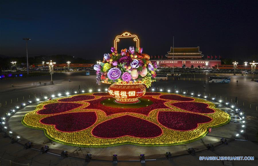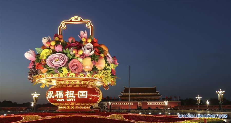 BEIJING, septiembre 28, 2017 (Xinhua) -- Una gran terraza de flores permanece en la Plaza de Tian'anmen, en Beijing, capital de China, el 28 de septiembre de 2017. (Xinhua/Yin Gang)